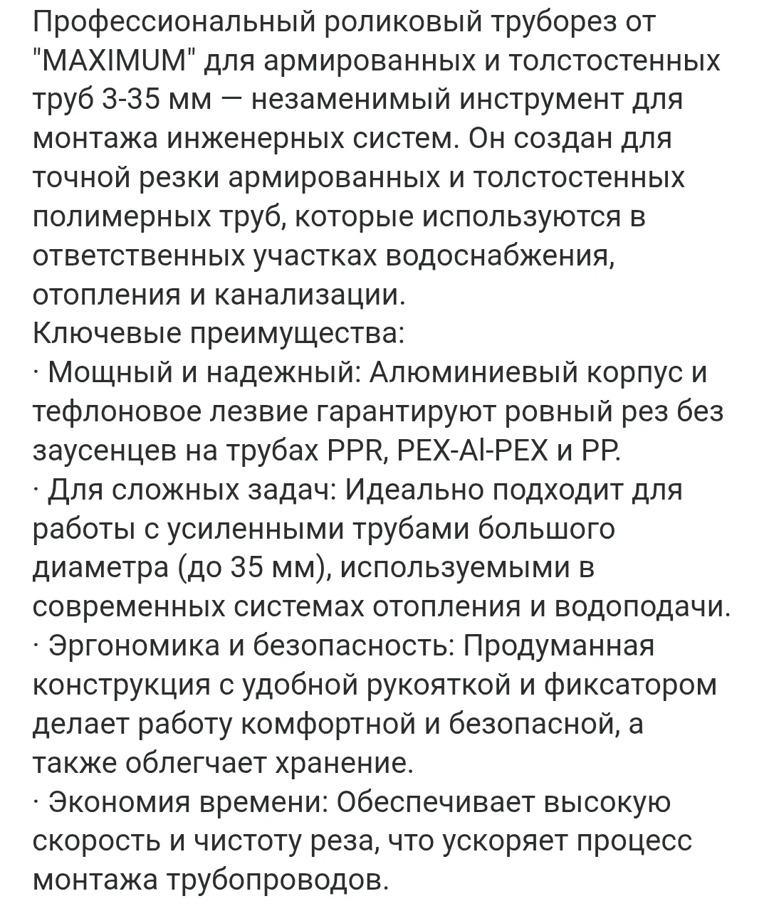 Профессиональный роликовый труборез от "MAXIMUM" для армированных и толстостенных труб 3-35 мм — незаменимый инструмент для монтажа инженерных систем. Он создан для точной резки армированных и толстостенных полимерных труб, которые используются в ответственных участках водоснабжения, отопления и канализации.